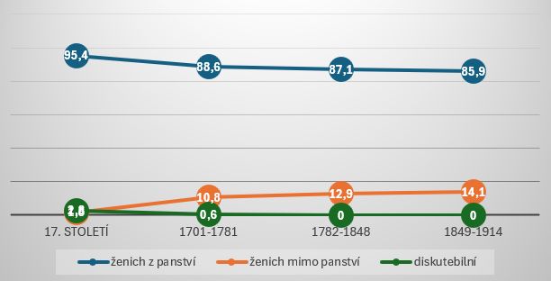 Pokud bychom si tedy vzali jen dvě kategorie - „ženich z panství“ a „ženich mimo panství“ (a ještě tedy kategorii "diskutabilní"), vypadal by graf podle jednotlivých období takto:
