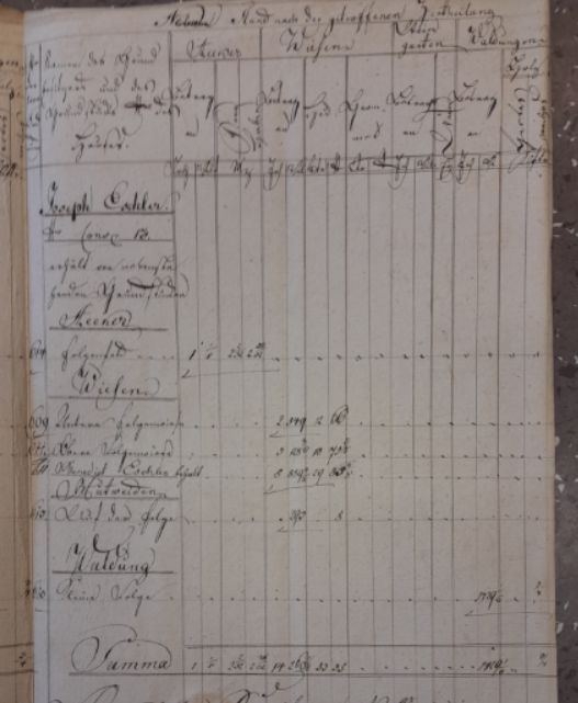 Dále dostal Josef také louky (raději uvedu jen současné míry): podzimní louka (to znamená, že dávala jen jednu, nikoli dvě seče ročně) č. 609 zvaná Auf der Folge nebo Untere Folgenwiese o rozloze 13484 m2 a ročním výnosu 709 kilo sena. Louka Obere Folgenwisese č. 611 byla rozdělena, takže z původní výměry 66964 m2 s výnosem 2272 kilo sena připadlo Josefovi 17727 m2 a Benediktovi zůstalo 49237 m2 s výnosem 1672 kilo sena. Dále byla Josefovi připsána malá pastvina Auf der Folge č. 613 o rozloze 1054 m2a výnosu 45 kilo sena a lesík Kleine Folge neboli Folgenbüschel o rozloze 5140 m2 a ročním výnosu 0,7 sáhu dřeva ročně (nejspíše 3,41 m2).
