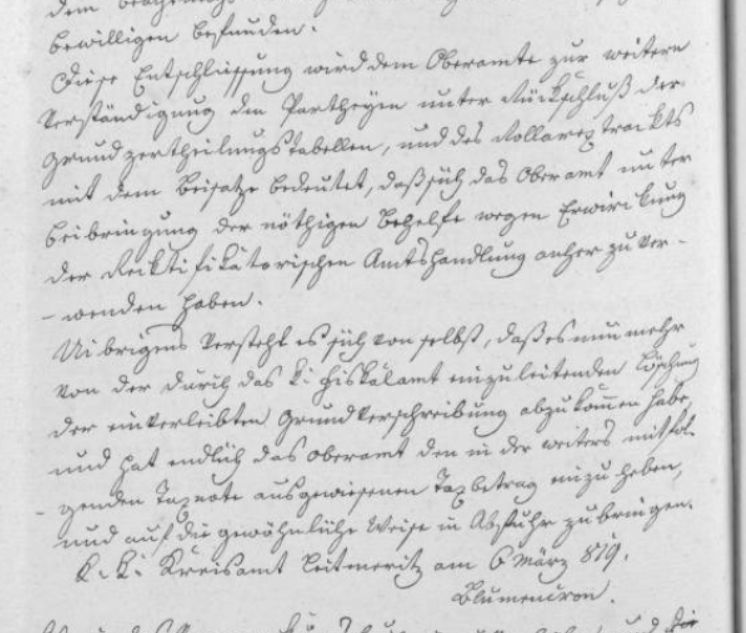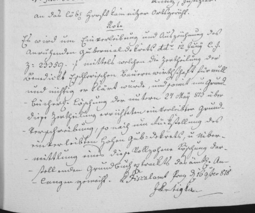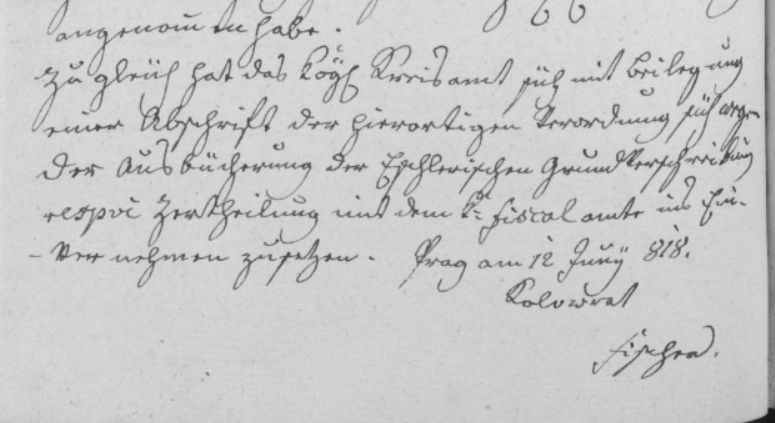 Nakonec gubernium pověřilo krajský úřad, aby se s opisem tohoto rozhodnutí obrátil na fiskální úřad „kvůli knihovnímu výmazu , resp. rozdělení (pozemků) z pozemkové knihy“. Následovalo jen obligátní: „Praha, 12. června 1818. Kolowrat. Fischer.“
