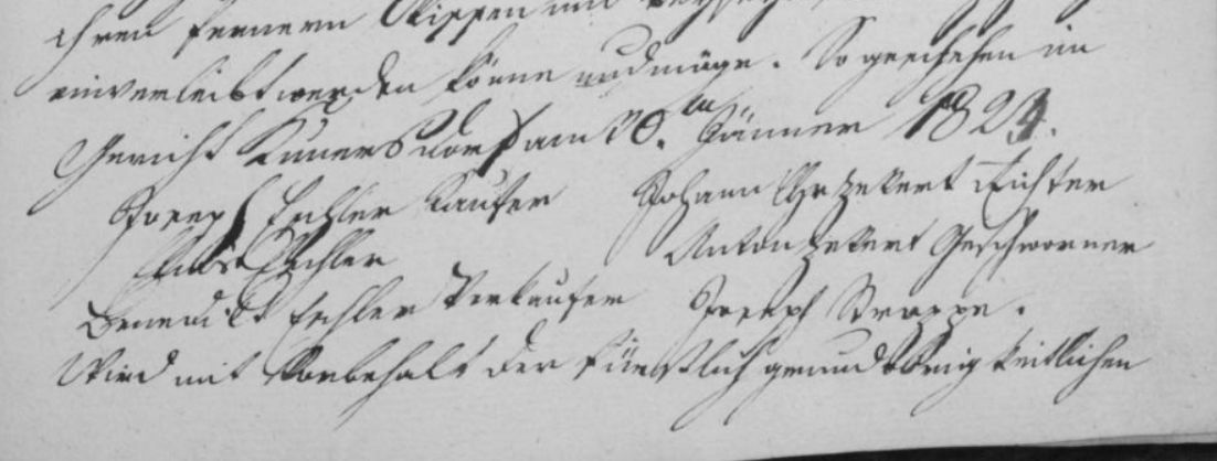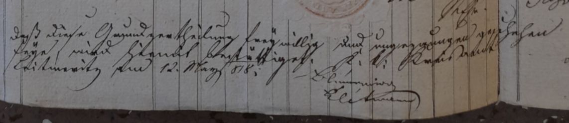 Vlevo vidíme krasopisné podpisy obou bratrů, narozených v letech 1791 a 1793. To již byla nová generace - otec Elias (ročník 1757) byl ještě negramotný, neuměl se ani podepsat a smlouvy signoval třemi křížky, jak je zaznamenáno u kupní smlouvy. Snad se na stará kolena Elias pokusil naučit podepsat, ale jeho pokusy skončily takto:
