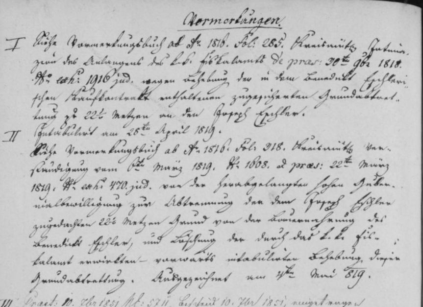 - Všechna rozdělení "bez předběžného souhlasu" gubernia jsou na základě bezprostředně před uzavřením kupní smlouvy vydaného zpřísněného guberniálního nařízení z 17. prosince 1812, č. 45343, kterým byl oznámen dekret dvorské kanceláře z 19. listopadu 1812, "prohlášena za nulitní a neplatná".