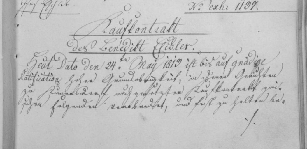 Tímto je vrchnímu úřadu proti potvrzení přijetí předána sem dorazivší (myšlen tedy litoměřický krajský úřad) nota fiskálního úřadu č. 6863 z 16. listopadu tohoto roku o provedení výmazu protizákonné a zemským orgánem (myšleno tedy české gubernium) anulované kupní smlouvy o na zdejším panství provedeném rozdělení selského hospodářství Benedikta Eschlera s nařízením bezodkladně prokázat jeho provedení.