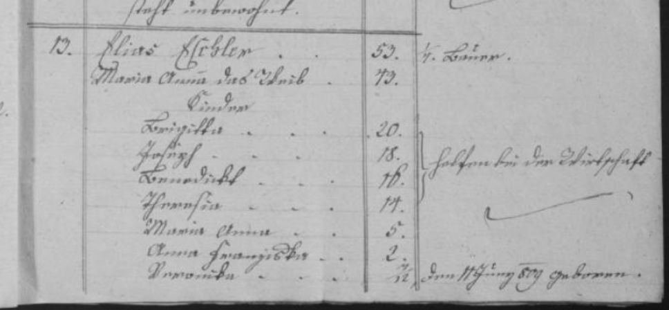 Víme, že nejstarší dcera Eschlerových Brigitta se o rok dříve vdala na sousední statek čp. 11. Takže rodina Eschlerových na statku čp. 13 v Kunraticích vypadala v lednu 1813 takto: