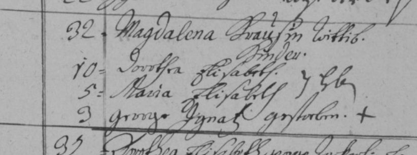 Malý Georg Ignaz se narodil již jako pohrobek, protože otec Georg Krause zemřel v mladém věku 35 let tři týdny před narozením syna. Zůstala po něm 29letá vdova Magdalena a dvě malé děti: 6letá Dorothea Elisabeth a 2letá Maria Elisabeth; tři týdny po otcově pohřbu se pak narodil Georg Ignaz. I malý Georg brzy umřel, pohřben byl 6. března 1740. Z pěti dětí Krauseových tak nyní naživu byly jen dvě - Dorothea Elisabeth a Maria Elisabeth