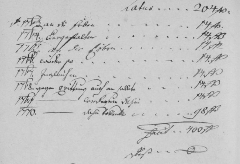 I nadále každý rok Dorothea Elisabeth splácela 14 kop grošů. Až přišel rok 1770. K doplacení zbývalo sedm ročních splátek. Dorothea Elisabeth čekat nechtěla a dědicům nevlastního dědy splatila rovnou celých sedm splátek dohromady, celých 98 kop grošů. To byla cena průměrného místního domku…