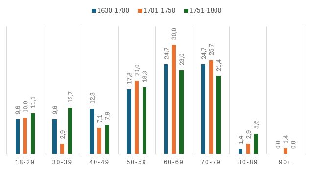 Nejvíce žen, 30 %, umíralo ve věku 60-69 let. Trochu přibylo 80letých žen a tu a tam se vyskytla i 90letá (nejstarší žena narozená mezi lety 1701-1750 zemřela v 93 letech).