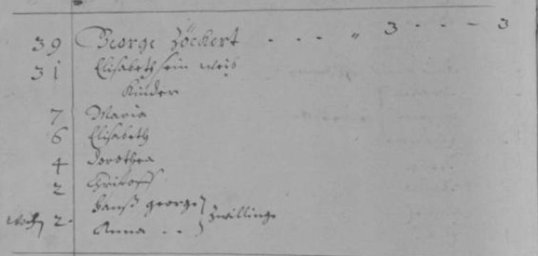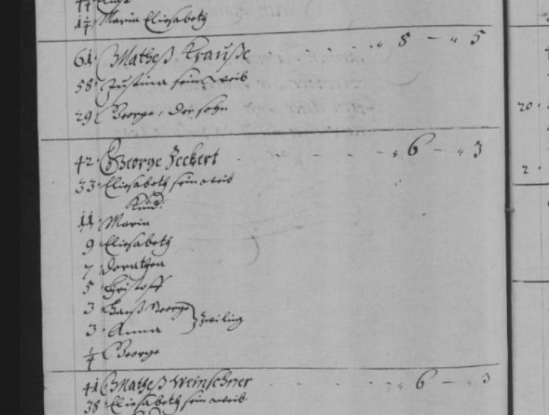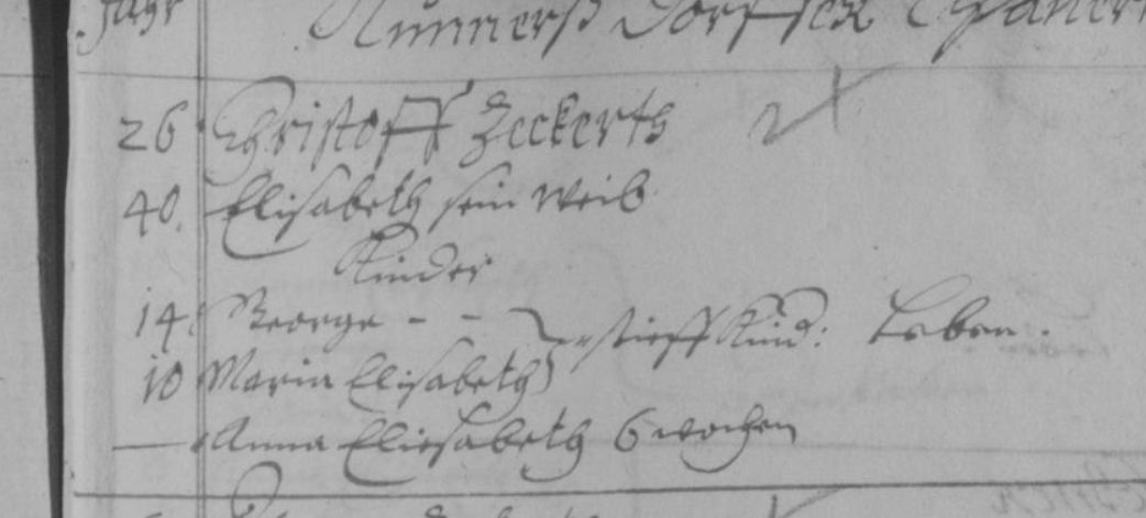A máme je: Georg Zeckert (zde tedy psán Zöckert, v naší oblasti již byla příjmení ustálená podle rodu, nikoli podle statku jako jinde, ale ještě neměla ustálenou gramatickou podobu), 39 let, Elisabeth, „jeho žena - sein Weib“, 31 let. Ze zápisu vidíme, že Christof měl tři starší sestry Marii, Elisabeth a Dorotheu (z matrik víme, že žádné dítě manželům dosud neumřelo). Pak je tedy čerstvě dvouletý Christof, náš hrdina, a dva týdny před pořízením soupisu (opět z matrik víme, že byla pokřtěna 28. prosince 1693) se narodila dvojčata Hans Georg a Anna.