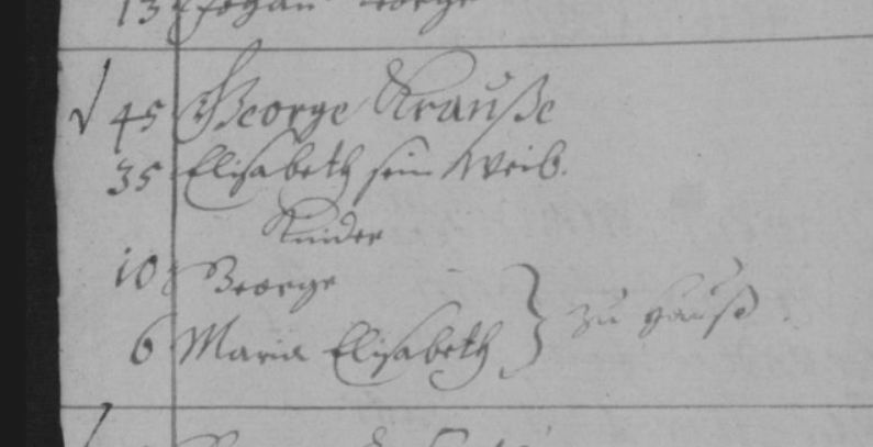 Dvě děti? No, vlastně tři - ještě šestitýdenní Anna Elisabeth. Ta už je ovšem Zeckertová, nikoli Krauseová. Soupis lidu byl psán v polovině ledna, takže se Anna Elisabeth narodila kolem poloviny listopadu. Tehdy ještě předmanželský sex zvykem nebyl, takže si můžeme říct, že Christof si vdovu Elisabeth bral někdy v lednu nebo únoru 1717; leden a listopad byly oblíbenými měsíci na svatbu.