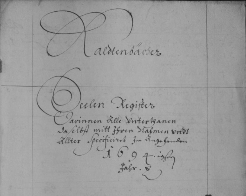 „Soupis obyvatel (doslova ale Registr duší) Studeného, obsahující všechny poddané tamtéž s jejich jmény a věkem. Upřesněn (doslova „specifikován") nastávajícího roku 1694.“