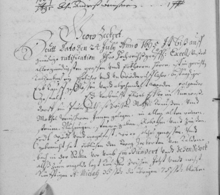 A text smlouvy. Samozřejmě opět v němčině. Začátek je „květnatý“, jak bylo v barokní době obvyklé: „Dnes, 24. července 1695, byla s milostivým schválením (ratifikací) Její římské hraběcí Excelence, našeho nejmilostivějšího hraběte a dědičného pána, na rychtě ve Studeném uzavřena a projednána poctivá a neodvolatelná dědičná koupě. Totiž: Prodává Elias Eschler v Kunraticích svůj statek, totiž ležící Mathesem Krausem a Mathesem Weinschnerem (čísla popisná byla zavedena až v roce 1770, takže aby byl statek v kupní smlouvě identifikován, uváděla se vždy jména dvou sousedů), ve všech starých hranicích, se všemi stavbami, požitky, daněmi, robotami a úroky, právě tak, jak jej dotyčný (myšlen prodávající Elias Eschler) užíval, Georgu Zeckertovi ze Studeného…“