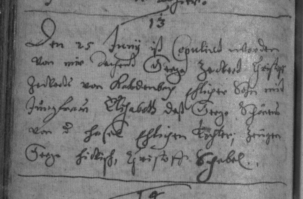 Zápis je pochopitelně v němčině - celý kraj byl německý a v němčině byly vedeny všechny písemnosti. Takže překládáme: „25. června byli oddáni…“ Zde nás snad může překvapit slovo „Copuliret“. Ovšem tehdy slovo kopulace nemělo stejný význam jako dnes. Slovo kopulace pochází z latiny. V klasické latině znamenalo „spoutávat, spojovat“; poté se význam posunul a ve středověké latině již sloveso copulo znamenalo „oddávat“ (nebo také „zasnubovat“).