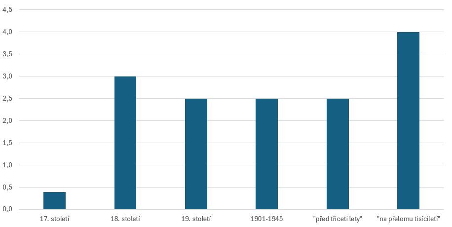 Vidíme tedy, že mezi třicetiletou a druhou světovou válkou se rodil téměř stejný podíl dvojčat jako „před třiceti lety“. Jak se toto číslo měnilo v průběhu jednotlivých staletí?