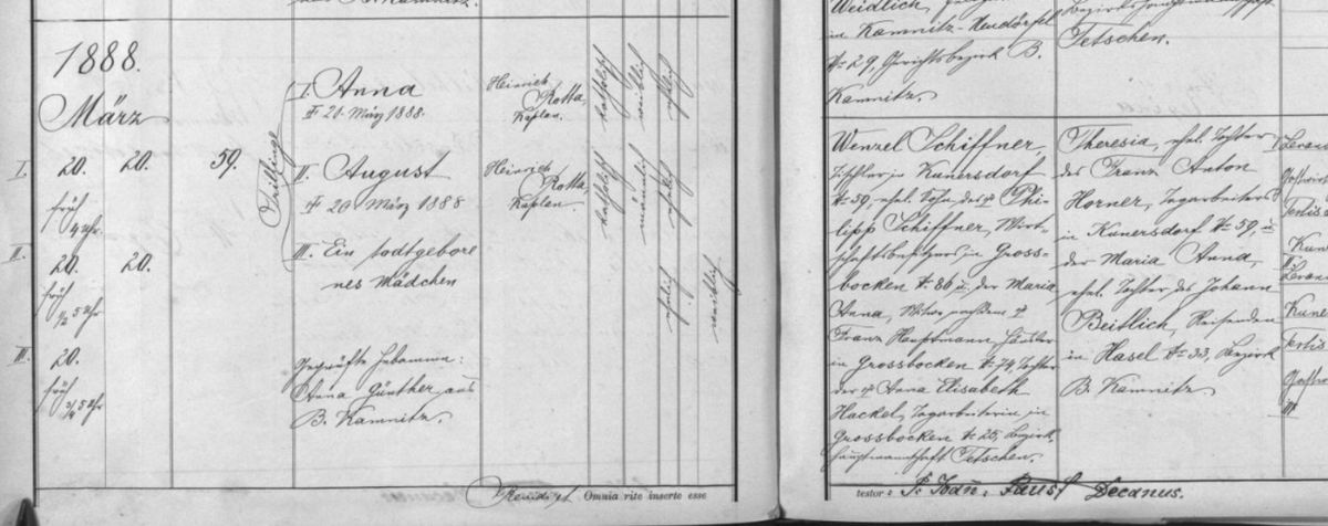 V brzkém ránu 20. března 1888 rodila Theresia znovu: ve čtyři hodiny ráno porodila dceru Annu, v půl páté syna Augusta a o čtvrt hodiny později mrtvě narozenou dcerku. Jsou to jediná zaznamenaná trojčata v této obci mezi třicetiletou a druhou světovou válkou. Ovšem dospělosti se nedožily ani živě narozené děti - obě zemřely ještě téhož dne.