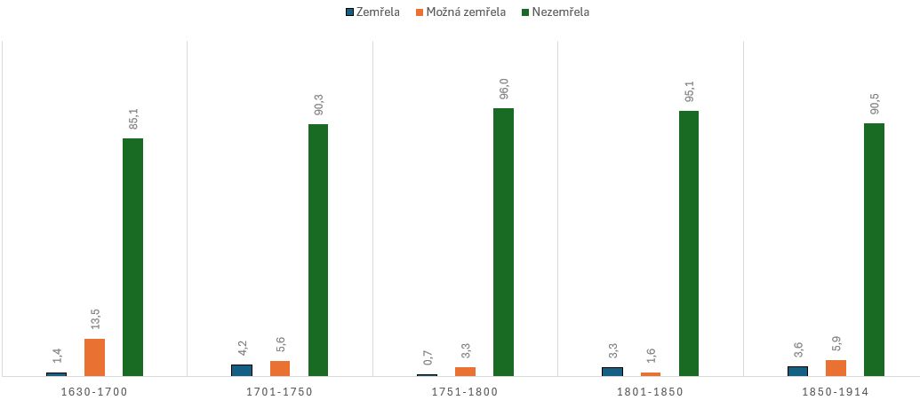I tady ale „bruslíme na tenkém ledě“. Již jsem psal v minulých článcích o nespolehlivosti matrik. Zkráceně: až do začátku 19. století do nich nebyly zapisovány nejen mrtvé děti, ale také některé děti, které se narodily živé, ale zamřely bezprostředně po porodu a nebyly pokřtěny. Tedy pokud žena v 17. nebo 18. století porodila mrtvé dítě a při/po porodu sama zemřela, víme jen o úmrtí rodičky, ale nemáme tušení, že se tak stalo při porodu.