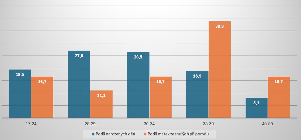 - Ženy starší 39 let porodily 8,1 % a 16,7 % při porodu zesnulých žen bylo starších 39 let.