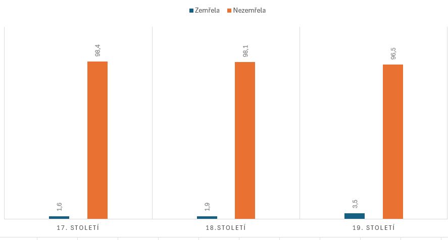 V 17. a 18. století tedy nejméně 1,6-1,9 % žen zemřelo na následky porodu. Naopak u více než 98 % žen, které porodily alespoň jedno dítě, byla příčina smrti jiná než porod nebo jeho následky.