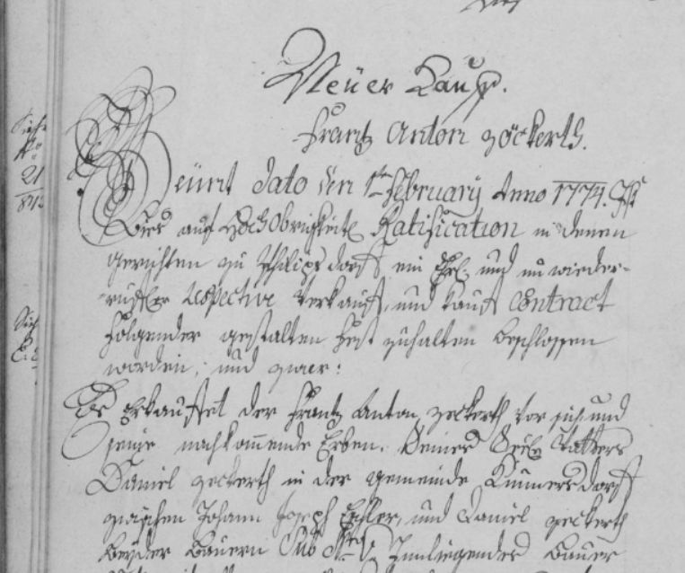 Franz Anton si celých 72 zlatých za šest nechal vyplatit na ruku hned po schválení smlouvy vrchností v únoru 1794; na oplátku tuto smlouvu uzavřel i za své dědice.