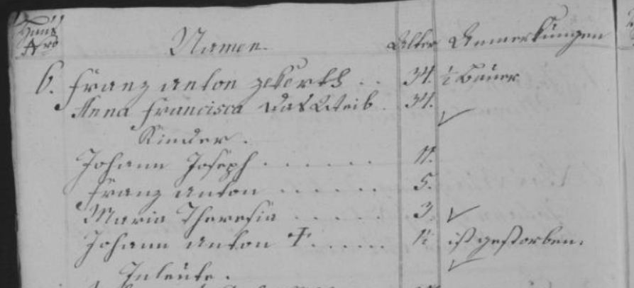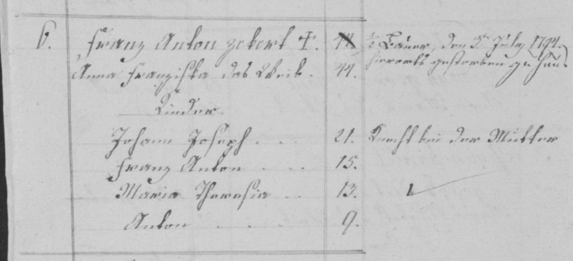 Starší dcera byla provdána na vedlejším statku čp. 1 , takže na našem statku čp. 6 po matce zůstali dva sirotci: 21letý Franz Anton a za dva týdny 18letá Maria Anna.