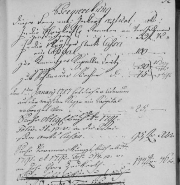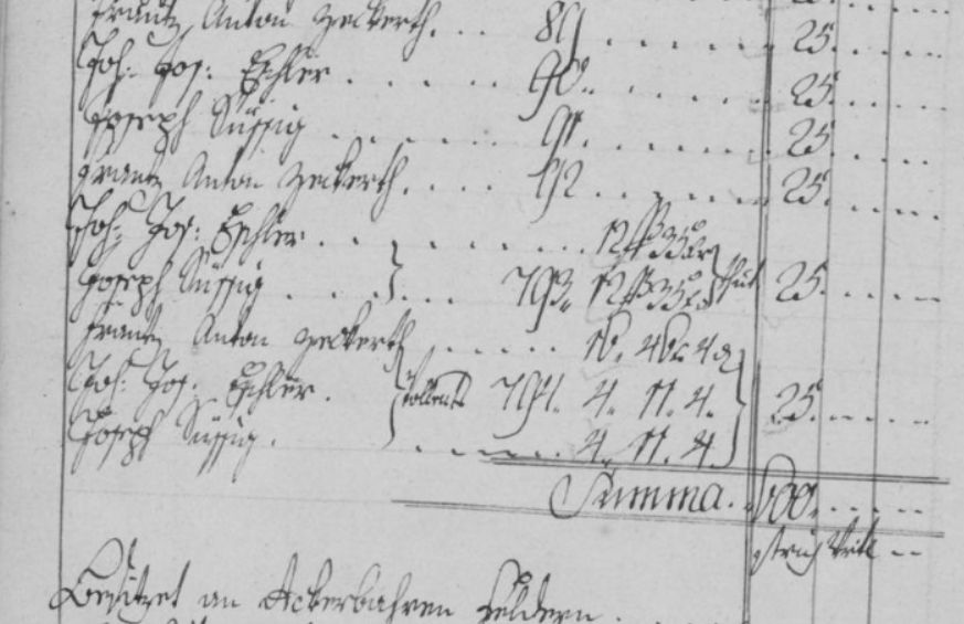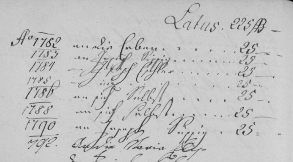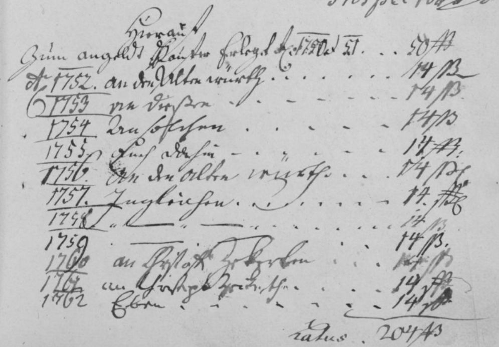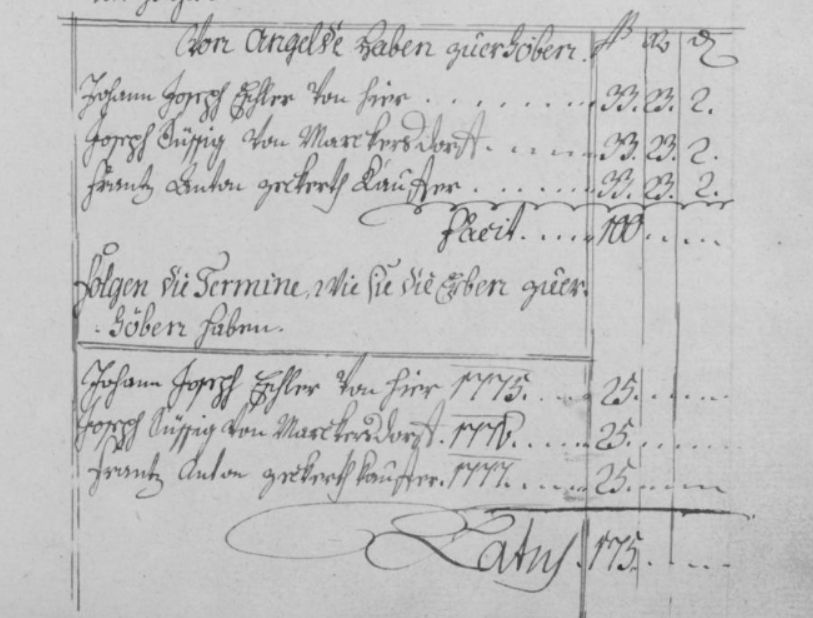 V těchto ročních splátkách už Franz Anton přesný nebyl: v roce 1775 sice správně zaplatil Josefu Eschlerovi 25 kop, o rok později ale nic nevyplatil švagrovi Süssigovi. To napravil o rok později, kdy Süssigovi vyplatil 25 kop a dalších 25 kop bylo odepsáno jemu. Dotud bylo vše v pořádku.