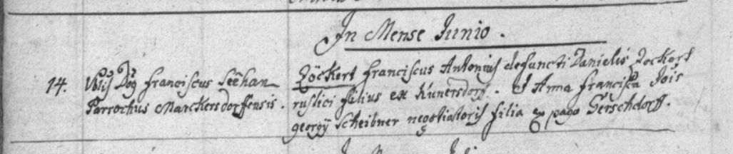 „V měsíci červnu, 14. (rok 1773, oddávající Franz Seehan, farář markvartický): Zeckert Franz Anton, syn zesnulého sedláka Danila Zeckerta z Kunratic. Anna Franziska, dcera obchodníka Johanna Georga Scheibnera z Kerhartic.“