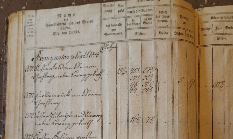 Dále jsou uvedeny rozměry v sázích, celková výměra 5 jiter 91 sáhů čtverečních (tedy 29 100 m2) s výnosem 50 a 19/32 měřice žita a 50 a 20/32 ovsa za tři roky (trojpolní systém - úhor, ozim, jařina); to je něco přes dvě tuny žita a necelé jeden a půl tuny ovsa. „Pozemek č. 201,5: skalní hřbet na Malém Grohbergu“, bez výnosu. „Pozemek č. 202: jeho pastvina na Querwg vedle Lorenze Zekertha“ o výměře 131 sáhů a roční výnosu 0,1 centýře sena. A tak dále…