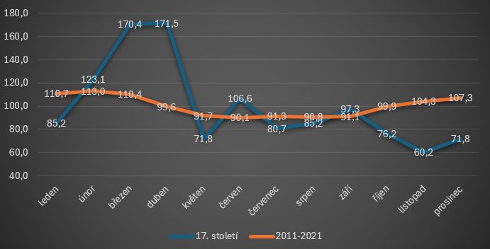 Srovnání 17. století a let 2011-2021 pak vypadá takto: