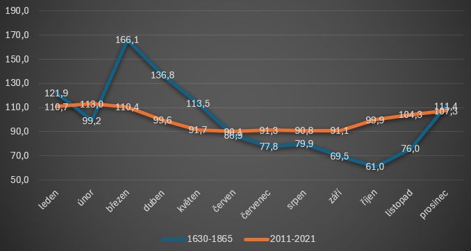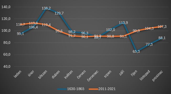 Grafů je hodně, ale ukážeme si ještě jeden: Spočítáme všechna výše uvedená století dohromady, takže dostaneme jednu křivku pro roky 1630-1865 a tu si srovnáme s dneškem, tedy roky 2011-2021: