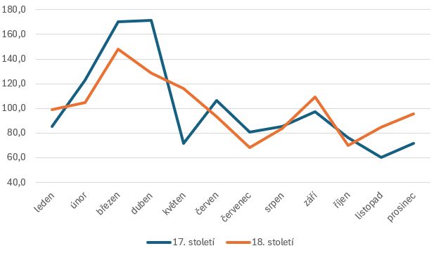 Srovnání úmrtnosti v průběhu roku, 17. a 18. století.