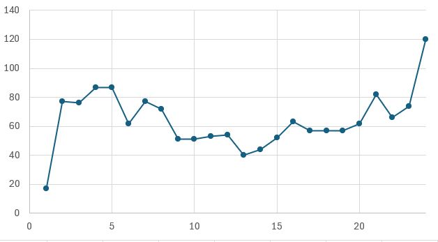 Pokud bychom začali půlnocí, pak by graf vypadal takto (v procentech):