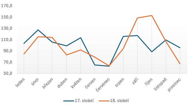 Vidíme, že v případě některých měsíců poměry zůstaly podobné - třeba v únoru, březnu, červnu, červenci. U některých měsíců se přitom čísla zásadně liší. Proč se v 18. století oproti 17. rodilo tolik dětí v říjnu a září? A naopak proč nastal v prosinci a lednu tak dramatický pokles. Přiznám se - nevím.