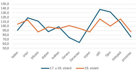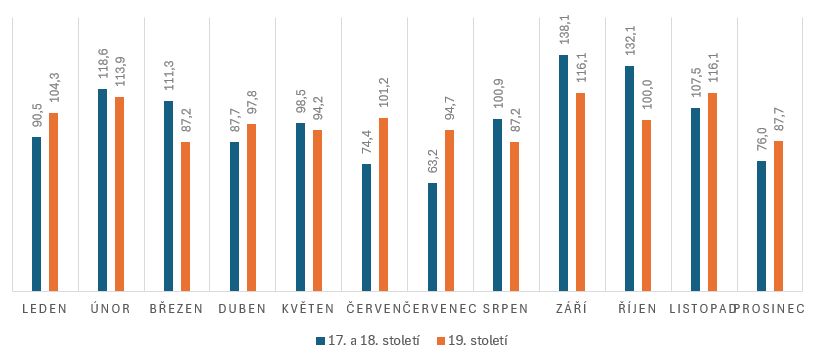 Leden se dostal do nadprůměru a i v únoru se v 19. století stále rodilo hodně dětí. Naopak březen poklesl pod průměr a pod průměrem se stejně jako dříve stále držely duben s květnem. Výrazně narostl počet porodů v červnu, takže místo 74,4 % porodů v 17. a 18. století jich v 19. století bylo nadprůměrných 101,2 %. Narostla také čísla v červenci, i když stále zůstával podprůměrným měsícem.