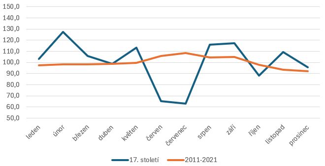 Pokud bychom chtěli grafické porovnání 17. století a let 2011-2021, vypadaly by křivky v grafu takto:
