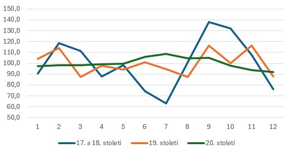 Vidíme, že v 19. století došlo oproti minulým století ke zploštění křivky a měsíce „se vyrovnávají“.