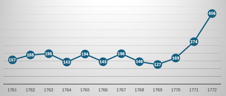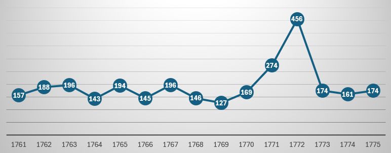 V roce 1772 jich zemřel téměř trojnásobek; v nejhorších měsících květnu - srpnu 1772 to byl více než trojnásobek.