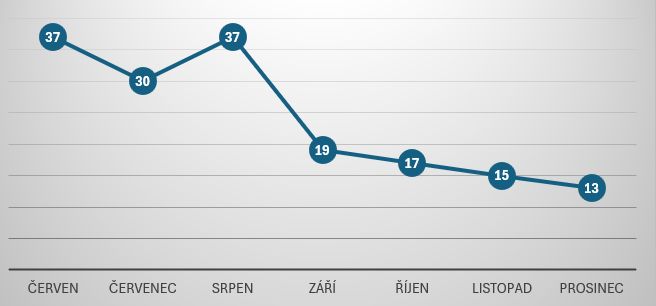 Měsíční počty zesnulých ve farnosti Česká Kamenice, červen-prosinec 1772.