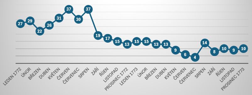 Jak začal rok 1772? Ještě hůře: v lednu zemřelo 27 lidí, v únoru už 29, v březnu se počet zesnulých snížil na 22, v dubnu byl 26.