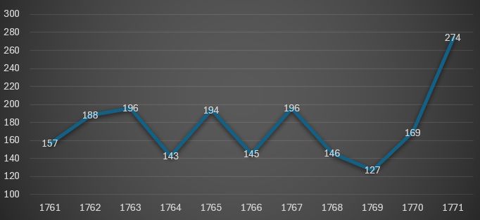 Nyní víme, že roční průměr těchto let byl v součtu 165 zesnulých a během let se počet nebožtíků pohyboval mezi 196 v letech 1763 a 1767 a 127 v roce 1769.