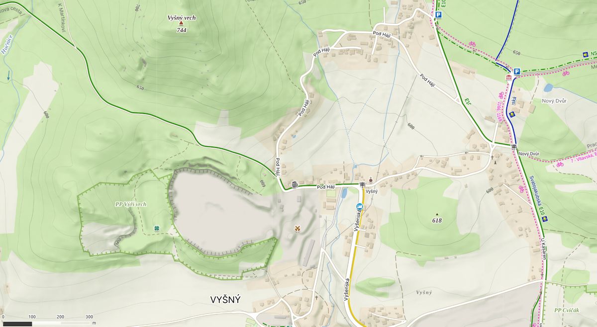 Vyšenská hospoda U Rumcajse je na plánku vyznačena pomoci piktogramu znázorňujícímu pullitr.