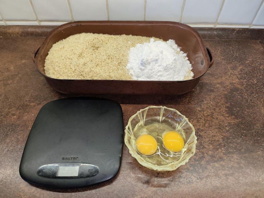 Suroviny pro přípravu těsta na Vánoční nebeské řezy: 600 g pomletých ořechů, 300 g moučkového cukru a 2 vejce