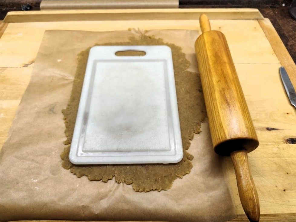 Letos jsem zkusil válet těsto pomoci dřevěného válečku. Přitom se osvědčilo dát pečící papír nejen pod těsto, ale po počátečním rozválení těsta pak další pečící papír i na těsto. V tomto případě se však nesmí pospíchat a tlačit, jelikož jak horní, tak hlavně spodní papír má tendenci se krabatit, což vede k roztržení válené placky.