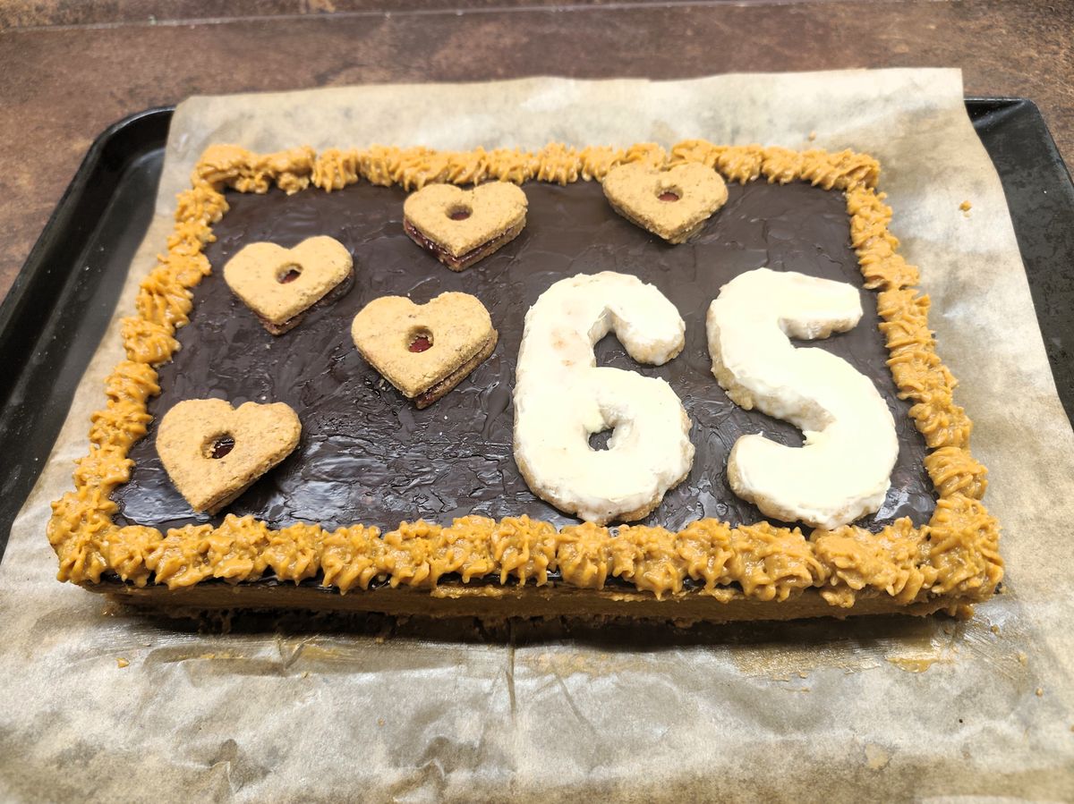 Nebeské řezy mohou mít i další využití pro období mimo Vánoc. Lze je nazdobit jako dort. Jak vyplývá z přiložených snímků, lze vytvořit zdobící prvky opět z těsta na Nebe v hubě, a to jak srdce vykrajovaná z vyválené placky, tak i číslice pro věk, které jsem připravil válečků dlouhých zhruba 15 cm o průměru cca 1 cm obdobným způsobem, jako se tvarují ořechové rohlíčky pro Nebe v hubě. Tj. postupným ohýbáním a zplošťováním válečků těsta. Jenom s ohledem na velikost je nutno zvolit větší tloušťku takto vytvořených číslic, než je tomu v případě rohlíčků pro Nebe v hubě.