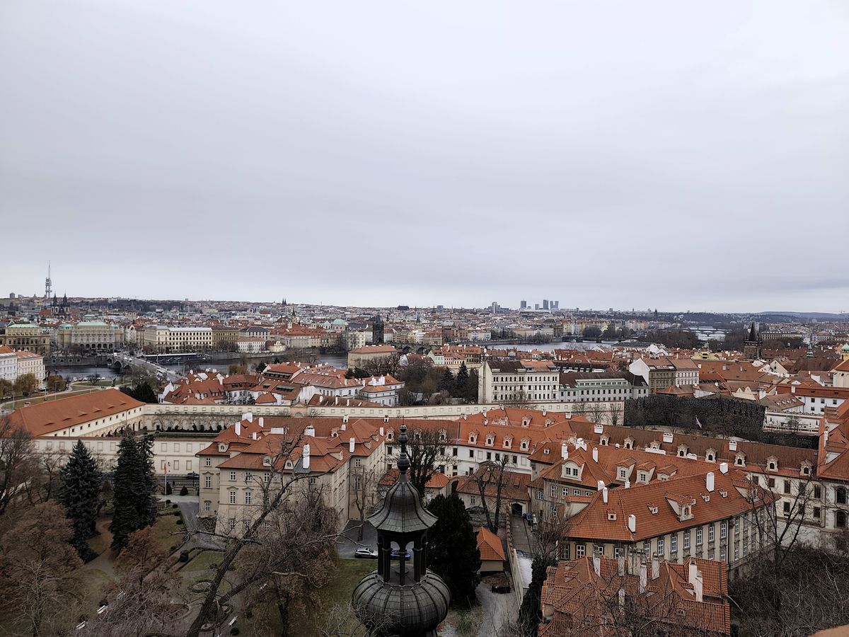 S davem individuálních návštěvníků či výprav vedených průvodci jsme vyrazili k Pražskému hradu po Starých zámeckých schodech. Již zde byly výhledy na Prahu směrem k jejímu centru. Nejlepší výhled pak byl na začátku Jiřské ulice. Na něj jsme si museli chvilku počkat, až se uvolní místo u hradeb. Do areálu Pražského hradu jsme se dostali stráženým průchodem pod Černou věží a pokračovali jsme dále Jiřskou ulicí k historické budově Rožmberského paláce, kde v minulosti sídlil Ústav šlechtičen.