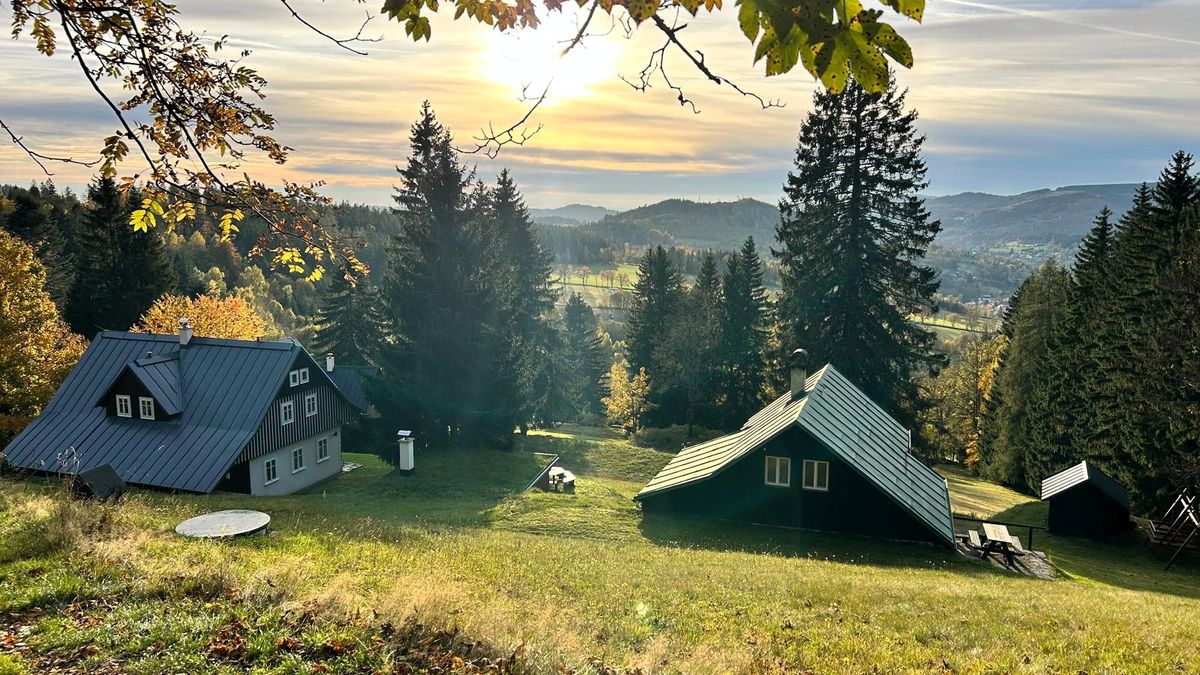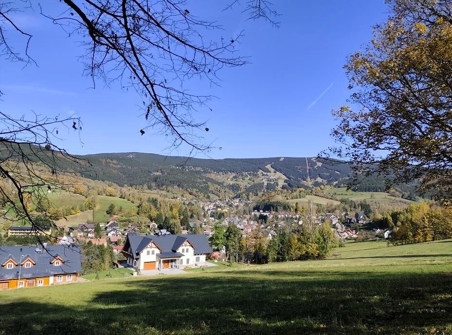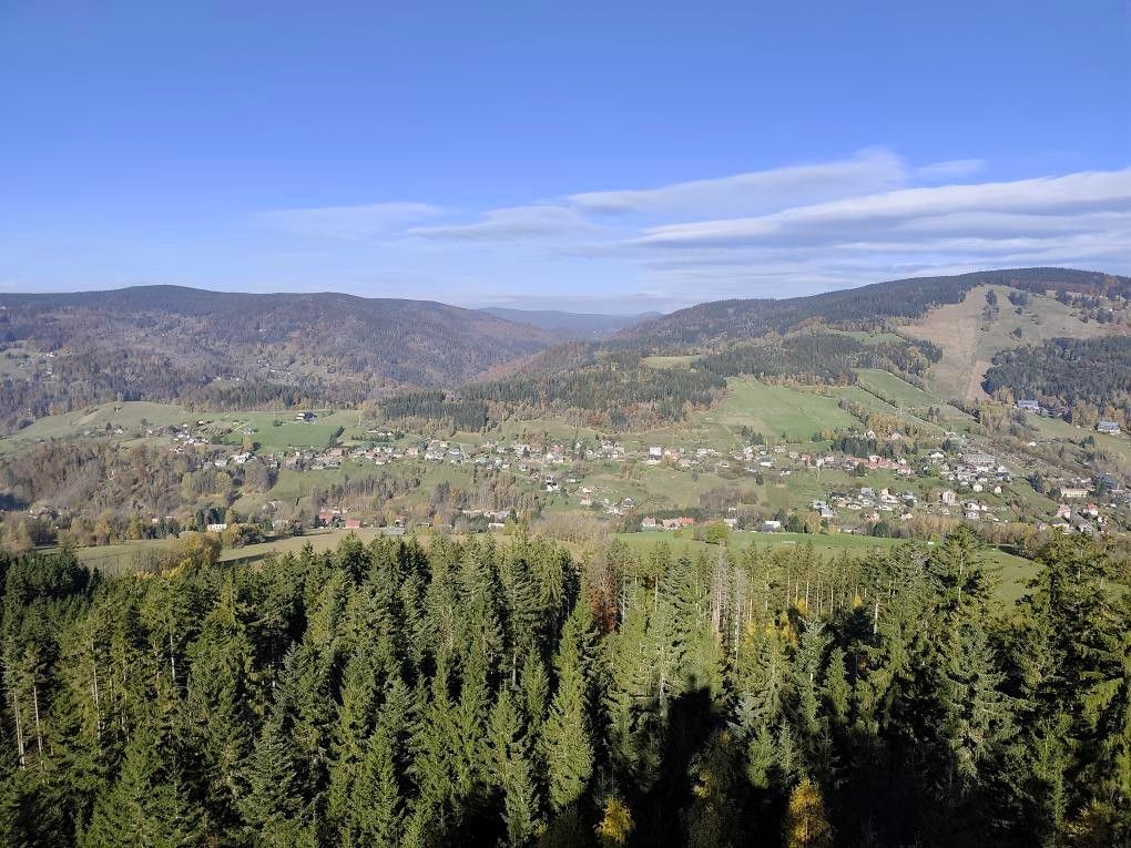 Ranní výhled na podzimní okolí Rokytnice nad Jizerou od našeho ubytování