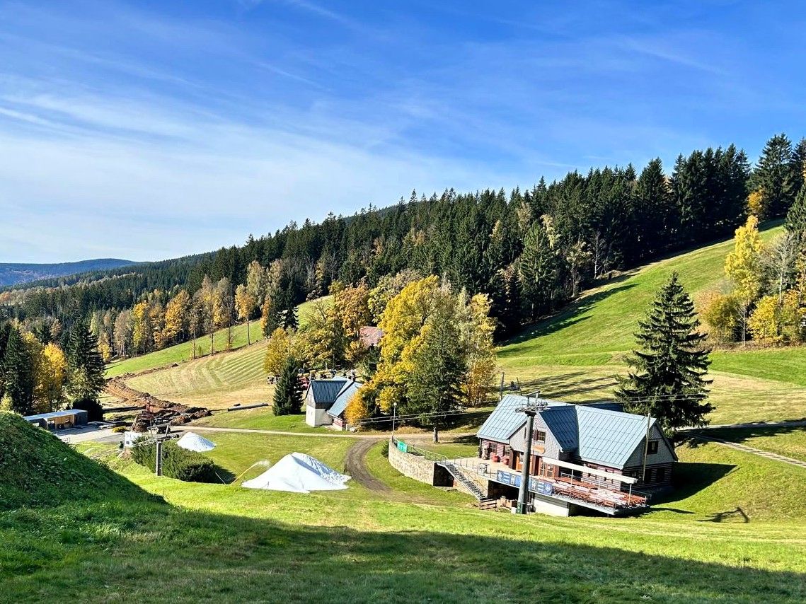 Možná si někdo řekne, proč jsme se na Dvoračky (1140 m n.m.) plahočili na krkonošské kyselo i po sjezdovkách. Prostě jsme chtěli jít, pokud možno, otevřeným terénem a do sytosti si v prosluněné přírodě užívat podzimních barev. Ale od Rokytnice směrem ke Dvoračkám si člověk nevybere. Tam čeká strmé převýšení prakticky vždy. Závěrečný úsek jsme absolvovali od Světlanky po horské asfaltce, přičemž zde je na vzdálenost 1,2 km k okraji lesa u Dvoraček převýšení 206 m. Tzn. záživné stoupání 17 % a podobné sousedním sjezdovkám. Navíc jsme při naší cestě spatřili, jak vlekaři na sjezdovce z Lysé hory již letos zasněžují.