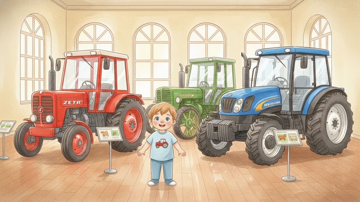 Uvnitř muzea to bylo ještě zajímavější. Tolik traktorů! Červený Zetor, modrý New Holland, zelený veterán s obrovskými koly… Evžen nevěděl, kam se dívat dřív. Připadal si jako v ráji.