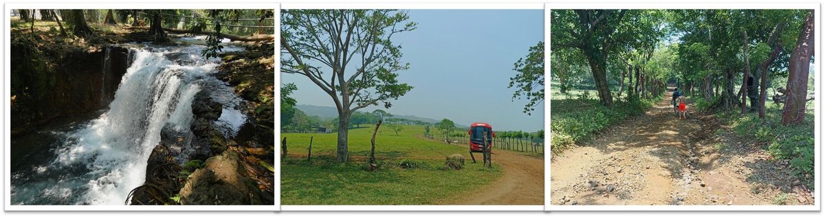 Vypadalo to, že jdeme z konce světa na ještě větší konec světa. Mezi ohradami s krávami a koňmi jsme po kamenité cestě lemované stromy s červenou kůrou došli k malému domečku. Okamžitě vylezla paní a zkasírovala nás za vstup k vodopádům. Už jsme se nemohli dočkat, až se osvěžíme. Bylo strašné horko a nehnula se ani větvička. Prošli jsme kolem dvou menších comedorů (jídelníček), které nás v těchto odlehlých končinách celkem zaskočily. Vodopády byly překrásné, hlavně plné naprosto dokonale průzračné a chladivé vody. Skočili jsme tam, jen jsme zasyčeli. Kluci brzy zjistili, že se do nich dá skákat ze skály na straně. Pak objevili provaz vedoucí skrz první vodopád. Tak nějak si představuji, že se cítí prádlo v pračce. Máchá vás to ze strany na stranu, horem spodem a točíte se dokola v napěněné vodě.