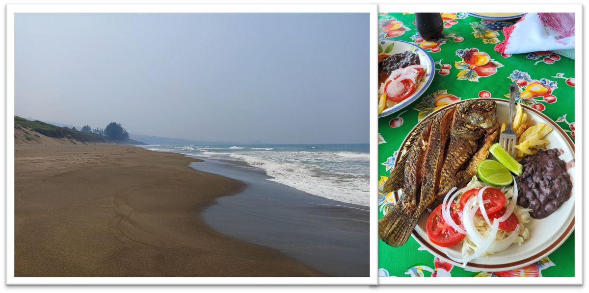 Další den jsme se vypravili na pláž k Mexickému zálivu. Od naší slečny domácí jsme věděli, odkud jezdí piratas (pickupy upravené pro převoz lidí, na korbě mají střechu a lavice). Jen jsme si mysleli, že jezdí co chvilku jako vše ostatní. Když jsme hnízdo piratas konečně našli, chlapík nám oznámil, že další jede za hodinu. Sedli jsme si na lavičku v čekárně. Za 2 minuty dorazily dvě starší paní, že chtějí taky do Montepía. Pak přišlo 5 puberťáků a že by taky rádi k moři. Chlapík do 5 minut přistavil auto, řekl: „Nastupte si, už se to formuje…“ a vyjeli jsme. Cesta byla zážitková, výhledy na takzvané mexické Švýcarsko (zřejmě kvůli kopečkům a kravám) úchvatné. Nechali jsme se vysadit nakonec až u odbočky na Cascadas Gemelas.