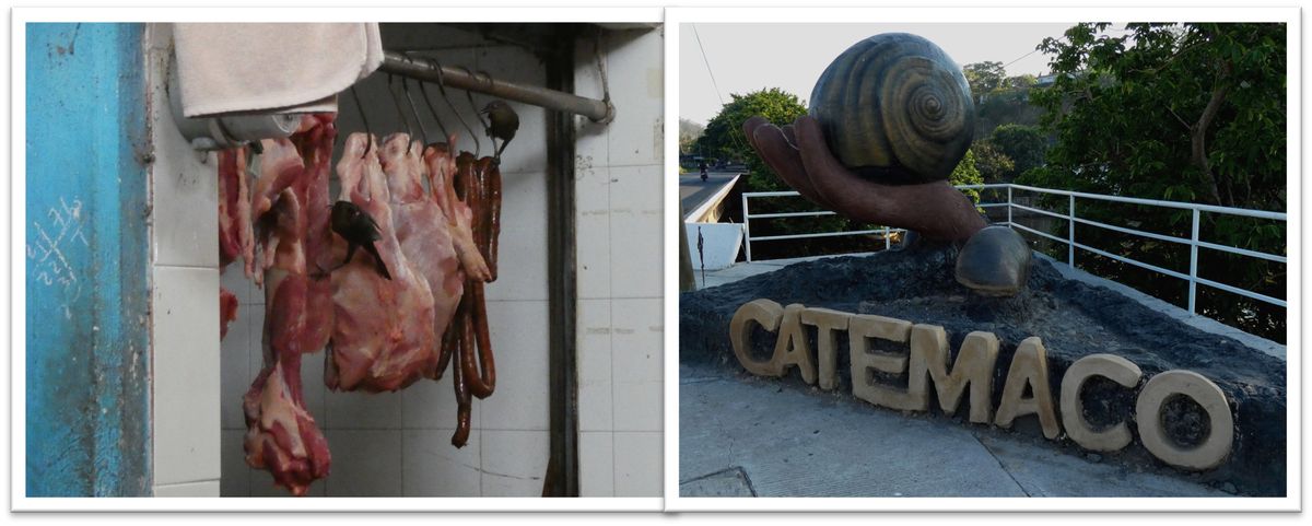 Ráno si kluci udělali školní úkoly do zásoby, protože v pokoji byl pěkný stůl a to se musí využít. Došli jsme si nakoupit jídlo a zabalili batohy na další cestu. Co se týče jídla, v Catemacu jsme učinili velmi odvážný pokrok. Koupili jsme si na mercadu syrovou panenku k obědu přímo z háku bez chlaďáku. Hned poté jsme viděli, jak si ve vedlejším stánku odskočil prodavač a maso mu tam ozobávali ptáci. Také jsme se odvážili ochutnat místní specialitu - jezerní šneky tegogolos v chutném salátku. Šneky loví v jezeře spousta chlapíků se šnorchly každý den. Mě to moc neoslovilo, panenka byla lepší. Z našich pokusů jsme vyvázli bez následků určitě jen proto, že naše dlouholeté cestování nás naučilo každý večer důkladně dezinfikovat trávicí ústrojí místním silným alkoholem.