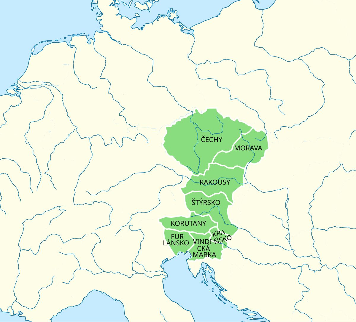 Území Přemysla Otakara II. v roce 1272, o značnou část zahraničních zisků díky Rožmberské zradě přišel (pouze krátké intermezzo Václava II. trochu ztrátu zacelilo)