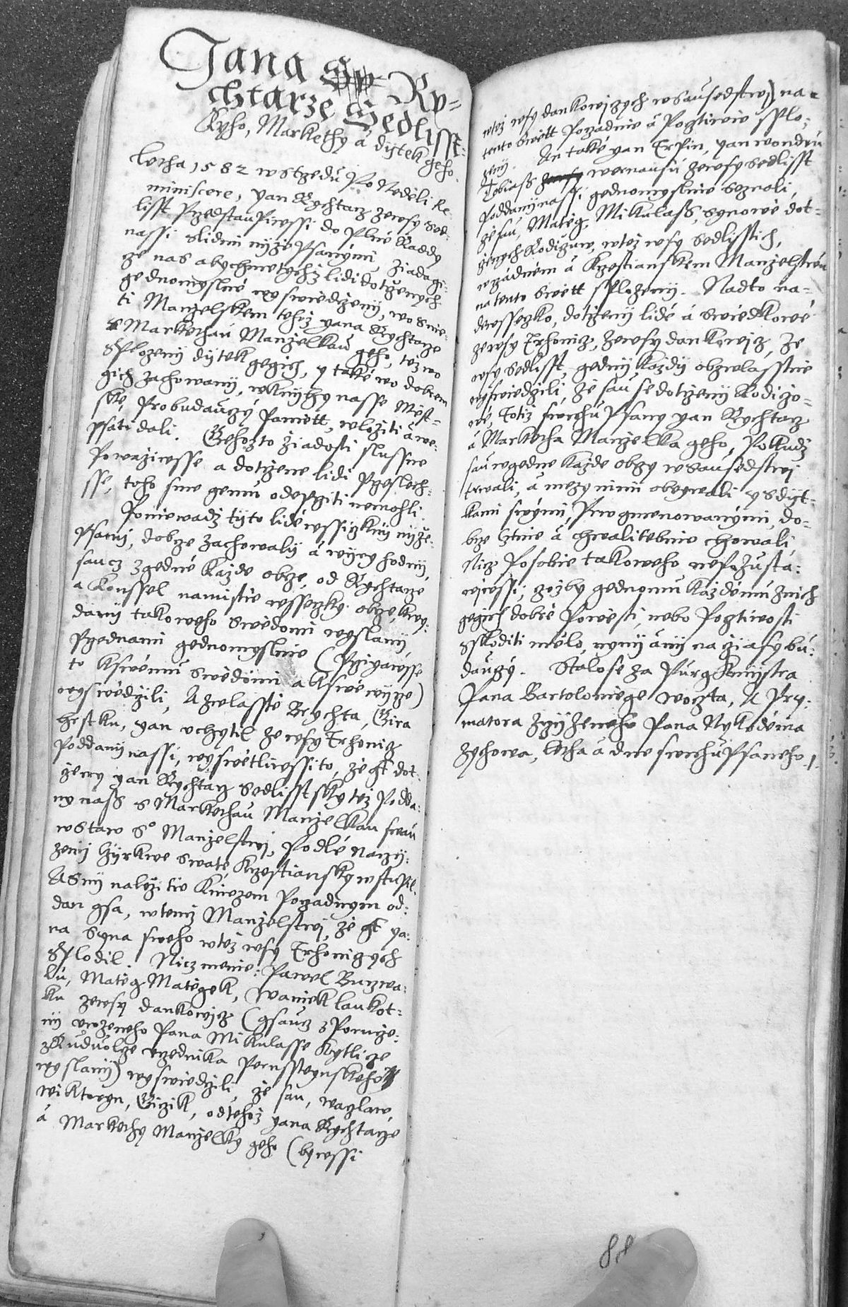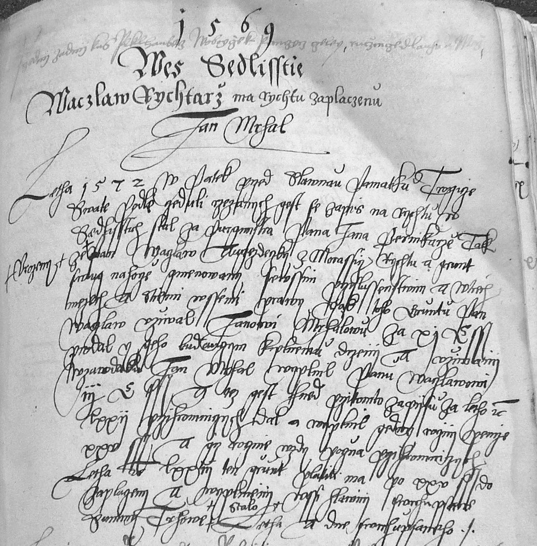 „Léta 1582 v středu po neděli Reminiscere Jan, rychtář ze vsi Sedlišť, předstoupivše do plné rady naší s lidmi níže psanými, žádajíce nás, abychom týchž lidí dotčených jednomyslné vysvědčení o snětí manželském téhož Jana rychtáře s Markétou, manželkou jeho, též o splození dítek jejich i také o dobrém jich zachování v knihy naše městské pro budoucí paměť vložiti a vepsati dali…“
